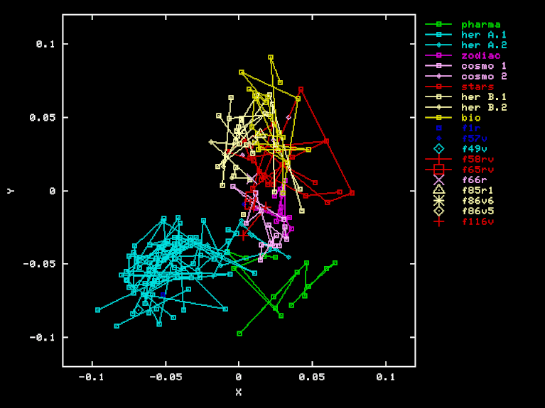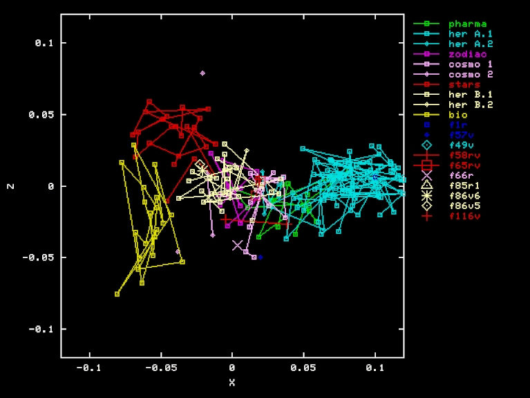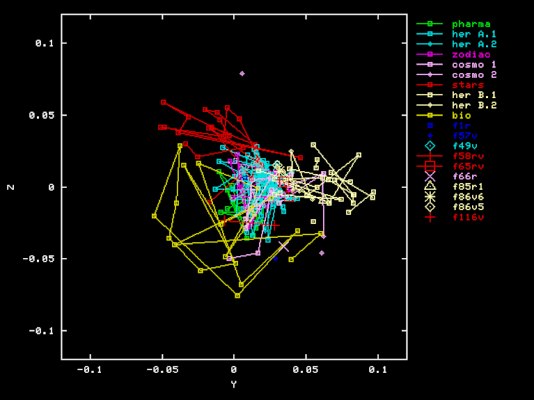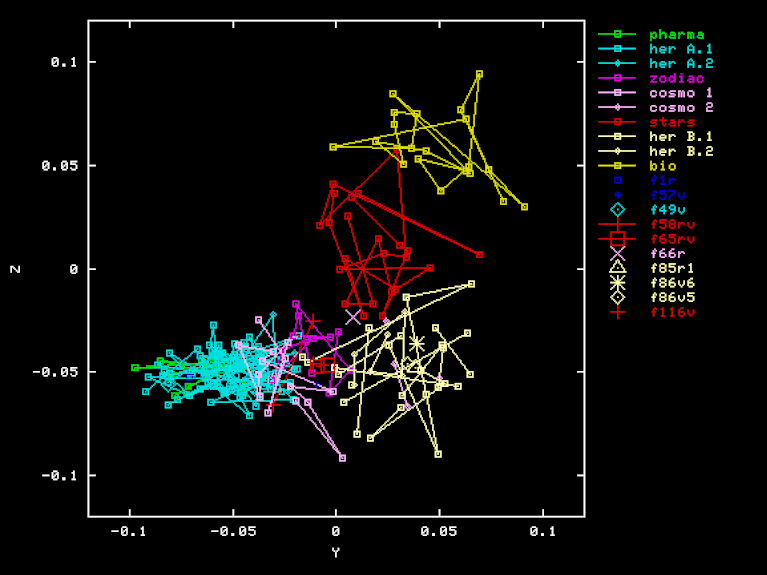 The "Pharma" projection is an attempt to discover a separation of Herbal-A pages from Pharma page, by using a different projection to three-space. The X, Y, and Z axes were obtained by orthogonalization of PHA-HEA, HEB-HEA BIO-HEA, where PHA is the vector of wordclass frequencies for the "Pharma" section. Here are the X, Y, and Z coordinates of each page in this projection.