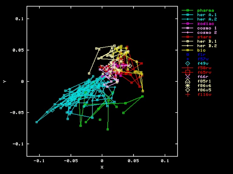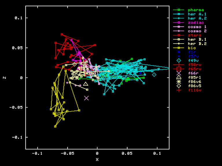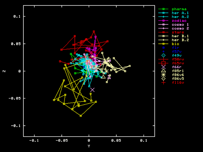 The "Pharma" projection is an attempt to discover a separation of Herbal-A pages from Pharma page, by using a different projection to three-space. The X, Y, and Z axes were obtained by orthogonalization of PHA-HEA, HEB-HEA BIO-HEA, where PHA is the vector of word frequencies for the "Pharma" section. Here are the X, Y, and Z coordinates of each page in this projection.
